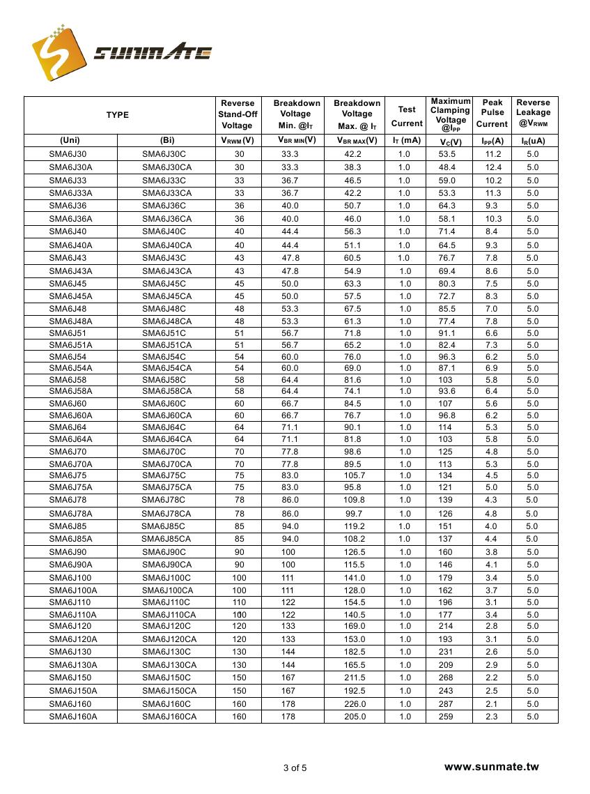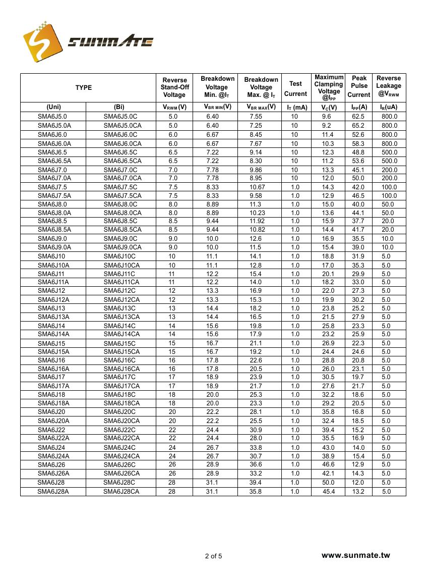 5.(800W瓦) SMB8J系列 SMB 封装 12.(6600W瓦) SM8S系列 DO-218AB 封装